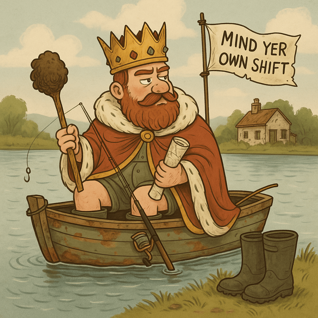 No crown just a captain’s hat. No throne just a folding chair with a drink holder and a fishing pole. But the ego? Titanic. Still Wants the Land though despite his aquatic ascension, he still claims dominion over the fields, sheds and ancestral drama. Because nothing says ‘I’ve moved on’ like asserting control over a place you refuse to actually be in. Long may he float. So here’s to His Majesty: Ruler of ripples. Dodger of duty. Commander of the canoe (well, okay – something with an outboard motor and a cooler full of cans). All hail. All laugh. All learned.