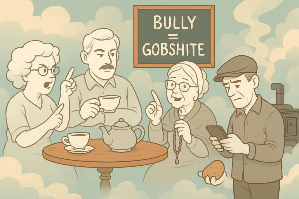 Granny (holding court from the corner, rosary beads in one hand, teacake in the other): ‘Back in my day, if someone acted like Bully, the neighbors would’ve taken turns calling him out – over tea, turf and turf wars. He’s lucky you’re not the sort to curse a man’s milk. But maybe you should be. You’re allowed to be angry, love. You’re not mad, you’re surrounded by people pretending their silence is sacred. It’s not. It’s manipulation in wellies.’