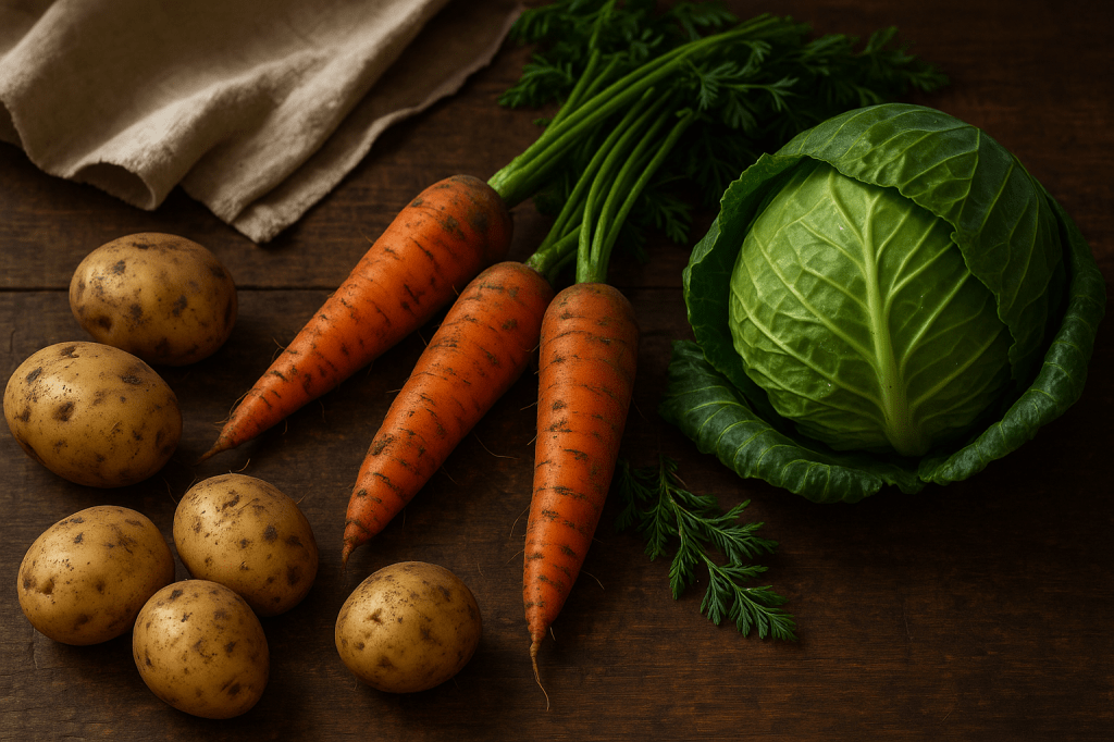 I know everyone expects the Irish to say bacon and cabbage, and don’t get me wrong, I’d wrestle a man for a plate of it on a cold day. But it’s the homegrown stuff that does it for me. Spuds you had to chase around the sink because they were still alive, carrots shaped like rude body parts, and cabbage so fresh it tried to crawl off the table.
