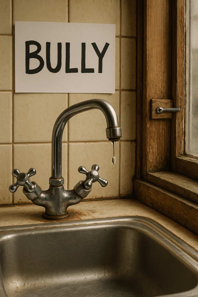 That tap has needed replacing for over three years. We even had a brand-new one sitting here, in its box, still shiny and untouched. But Bully, in all his infinite wisdom, refused to fix it. The same way he refused to fix the bedroom window he screwed shut instead. Because God forbid anyone else have fresh air or working plumbing in a house he saw as his inheritance-in-waiting.